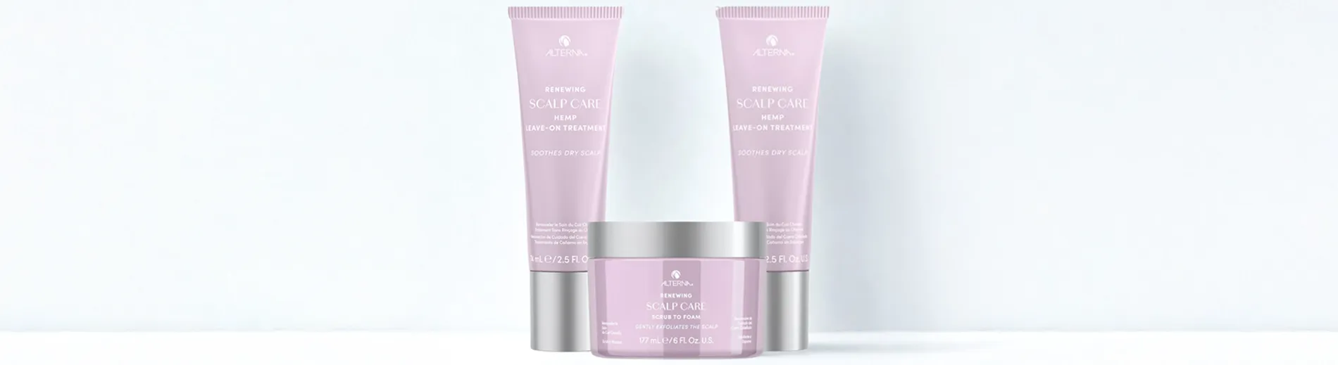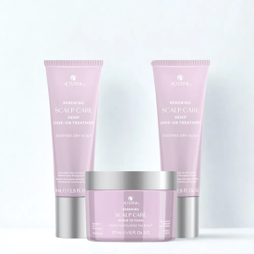 - Danach wird eine der beiden Leave-on-Pflegebehandlung für die Kopfhaut verwendet. Alterna Renewing Scalp Care Hamp Leave-On Treatment hinterlässt ein ruhiges, beruhigtes und weniger trockenes Gefühl auf der Kopfhaut, während das Alterna Renewing Scalp Care Peppermint Leave-On Treatment die Feuchtigkeitsbalance der Kopfhaut aufrecht hält.