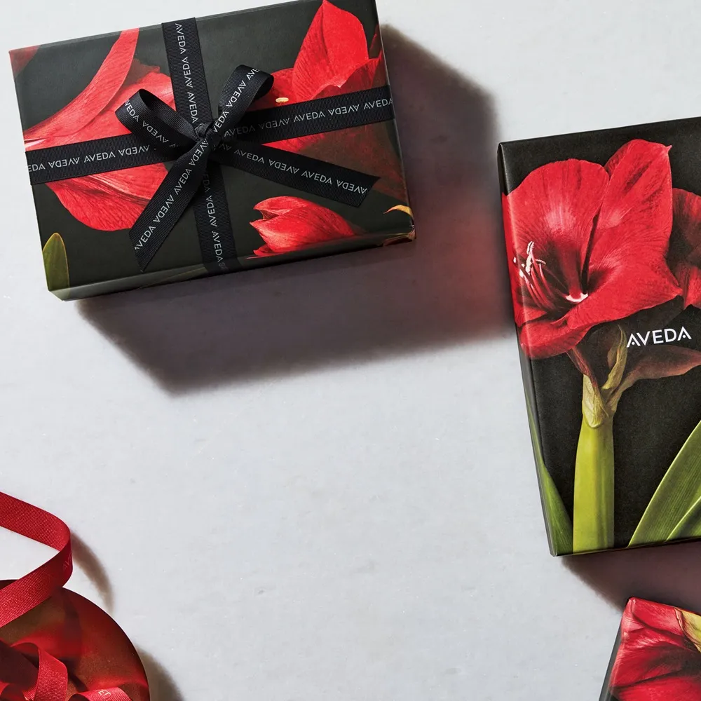 Die Holiday Sets erhalten ein rot-schwarzes Design, das mit der ausdrucksstarken Amaryllis Blume verziert ist. Sie verkörpert Selbstbewusstsein und Schönheit und taucht die Sets in kräftige, romantische Farben. Das edle Design verleiht den exklusiven Geschenksets von Aveda eine starke, luxuriöse und moderne Optik, die das Motto „Schenken mit Liebe“ besonders unterstreicht.
