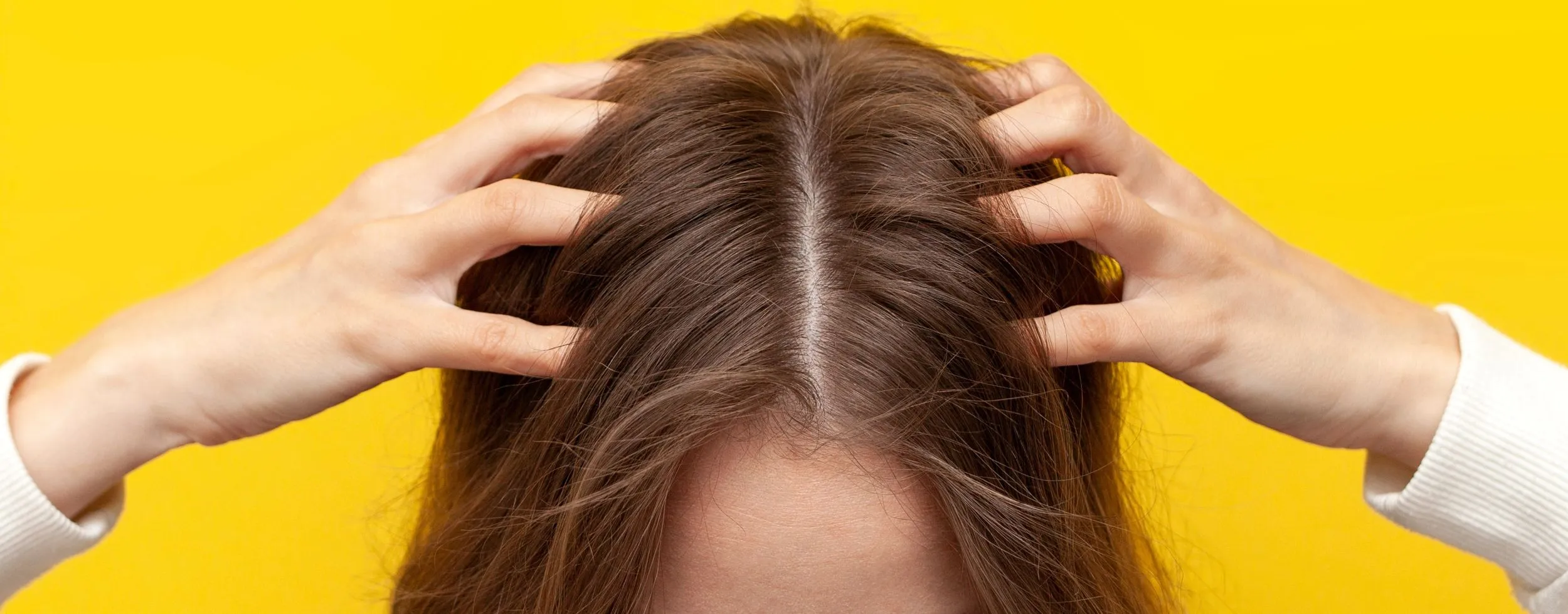 Frau mit langen dunklen Haaren greift sich auf die Kopfhaut