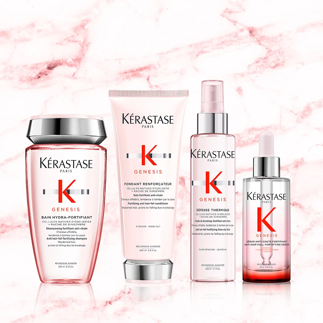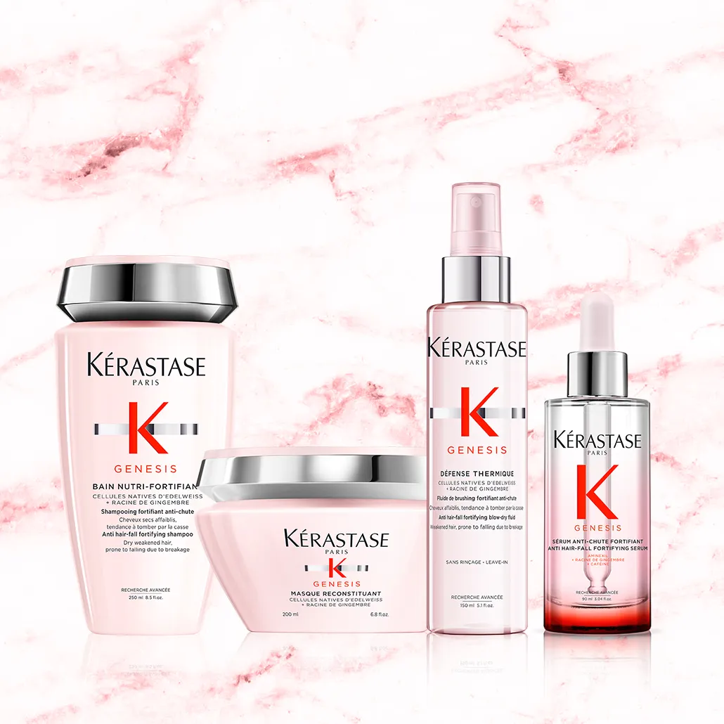 Kérastase Genesis umfasst ein Haarpflegesystem, das von zwei Shampoos (Kérastase Genesis Bain Hydra-Fortifiant für fettiges und Kérastase Genesis Bain Nutri-Fortifiant für trockenes Haar), über das Kérastase Genesis Fondant Renforcateur bis hin zur Kérastase Genesis Masque Reconstituant und dem Kérastase Genesis Defense Thermique reicht. Weiters gehört das mit Aminexil angereicherte Kérastase Genesis Serum Anti-Chute Fortifiant und die praktische Ampullenkur .Die Kombination der Produkte garantiert eine verwöhnende Haartherapie gegen Haarverlust und Haarbruch.