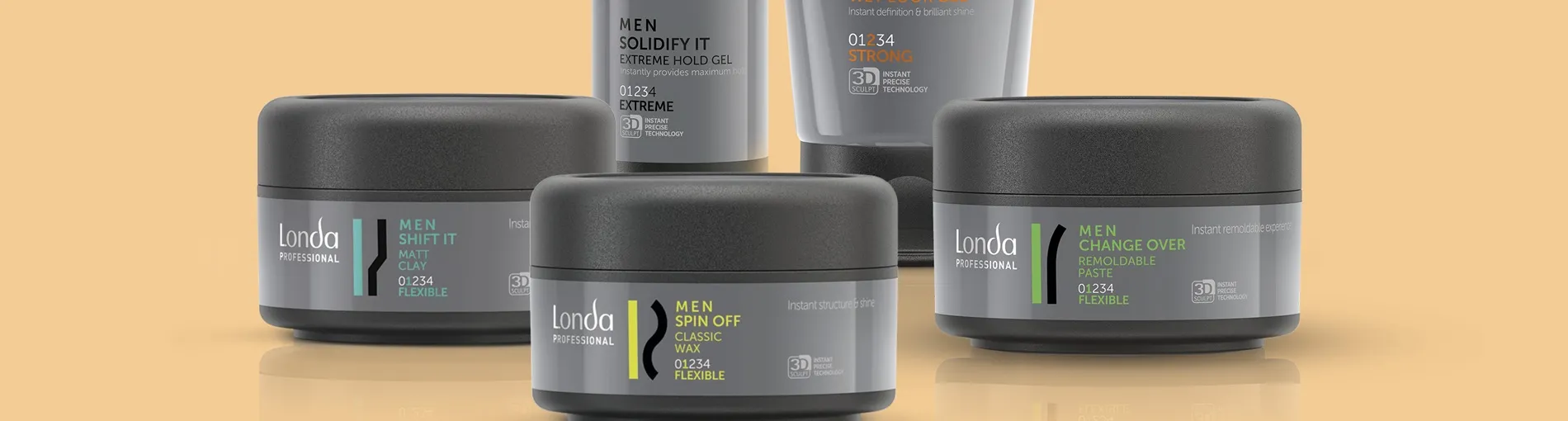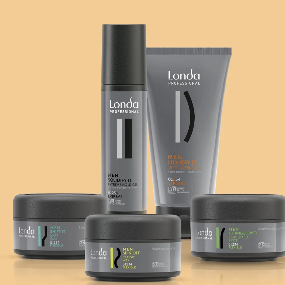 Die Stylingprodukte verleihen flexiblen bis starken Halt und geben sofort mehr Struktur, Textur und Glanz. Modebewusste Männer können ihrer Frisur mit Londa Men Styling matte Finishes geben und sich auf superstarken Halt verlassen. Einzelne Partien können mit dem sehr starken Londa Solidify It Gel betont werden, jedoch gibt es auch Produkte, die natürliche Stylings perfekt unterstreichen, wie die remodellierbare Paste Change Over. Für alle Männer, die sich ein mattes Finish mit starkem aber dennoch flexiblen Halt wünschen, gibt es Londa Shift It. Für Glanz und mehr Struktur kann Mann auf Londa Spin Off zurückgreifen.