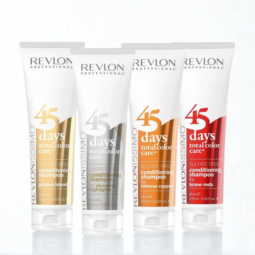 Das sulfatfreie Revlon Farbshampoo aus der Revlonissimo 45 Day Serie von Revlon Professional bietet Schutz gegen Farbverlust und hilft, die Zeit bis zum nächsten Farbservice zu überbrücken. Die Total Color Care Serie hilft, die Pigmente in der Haarfaser wieder aufzufüllen. Es ist je nach Haarfarbe in verschiedenen Varianten erhältlich.