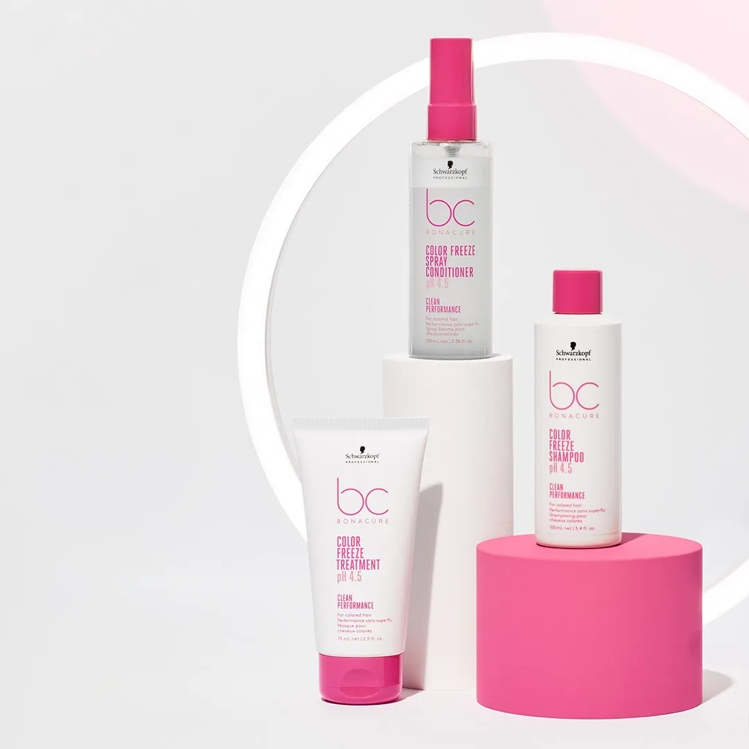 Diese Eigenschaften von Bonacure Color Freeze haben sich als effektive Haartherapie für coloriertes als auch für gesträhntes Haar erwiesen. Die Produkte eignen sich besonders zur Pflege nach einer Färbung sowie zur Farbbeständigkeit bis zu 90% für bis zu 30 Wäschen.