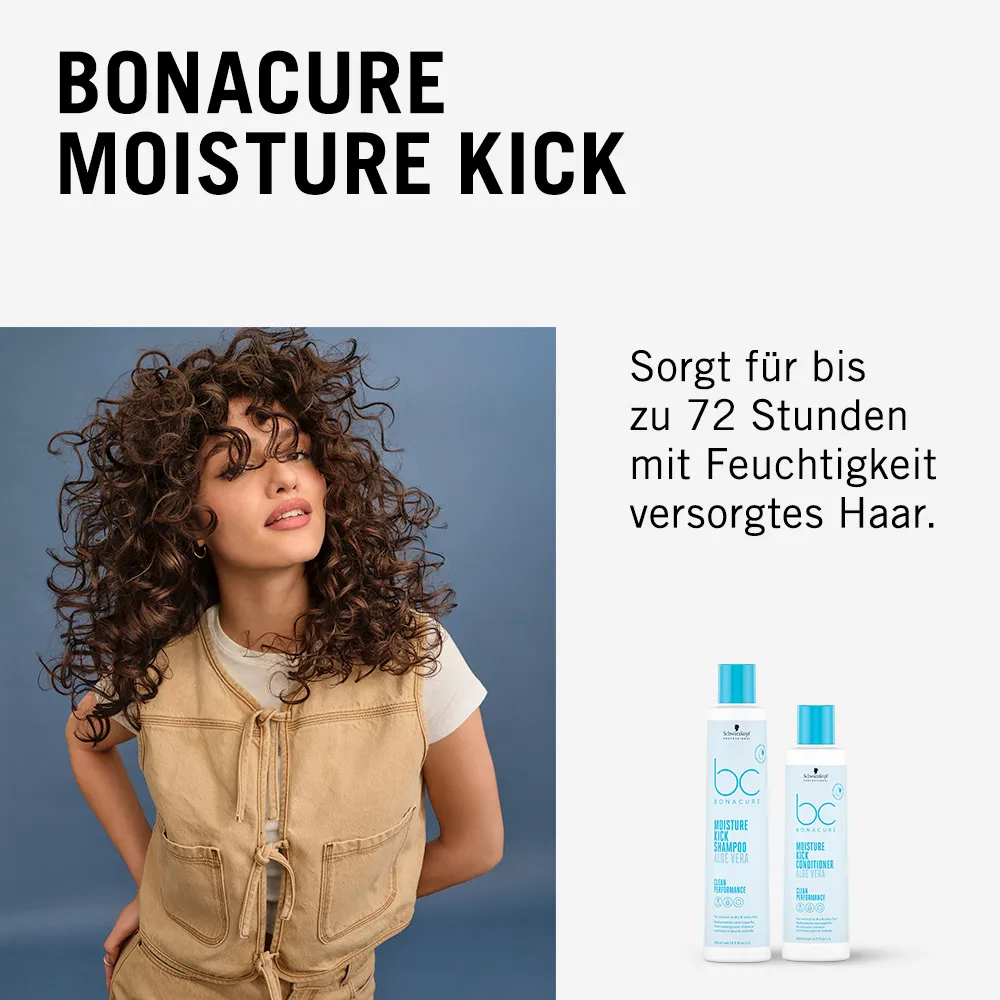 Moisture Kick gibt normalem bis trockenem Haar genau die richtige Pflege, die es braucht, um dauerhaft schön zu bleiben. Mit den Pflegeprodukten von Schwarzkopf Professional gelingt eine nachhaltige Rückführung zu einer ausgezeichneten Haarqualität. Feuchtigkeitspflege für trockenes Haar mit Bonacure Moisture Kick Schwarzkopf Bonacure Moisture Kick ist die optimale Pflegelinie für trockenes und sprödes Haar. Wenn es zu einem Feuchtigkeitsmangel im Haar kommt, verliert es an Spannkraft, Geschmeidigkeit und Elastizität. Wenn der Feuchtigkeitshaushalt des Haares aus der Balance gerät, sind schwer frisierbares und stumpfes Haar sowie trockene Längen und Spitzen die Folge.