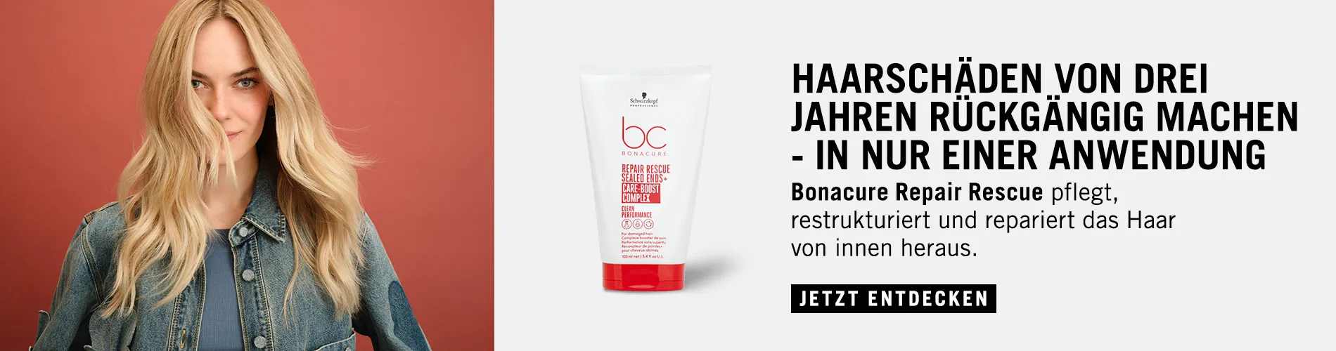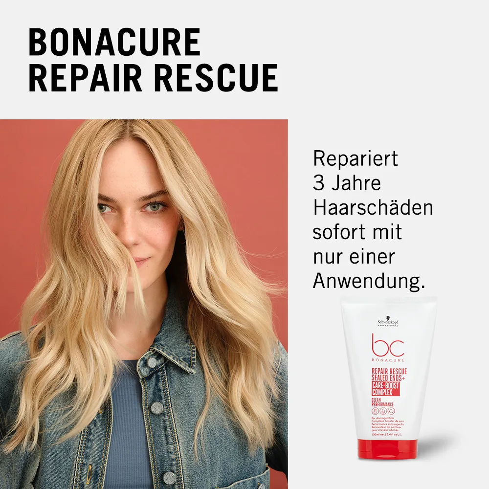 Die Bonacure Repair Rescue Pflegeserie von Schwarzkopf Professional vereint die Wirksamkeit von veganem Keratin und Arginin um strapaziertes und extrem geschädigtes Haar zu reparieren. Die Technologie beseitigt Haarschäden der letzten 3 Jahre, regeneriert das Haar und führt zu 95% weniger Haarbruch. Die gesunde Haarstruktur wird nachhaltig wieder hergestellt und die Haaroberfläche versiegelt. So wird das Haar vor erneuten Schäden und Haarbruch geschützt.