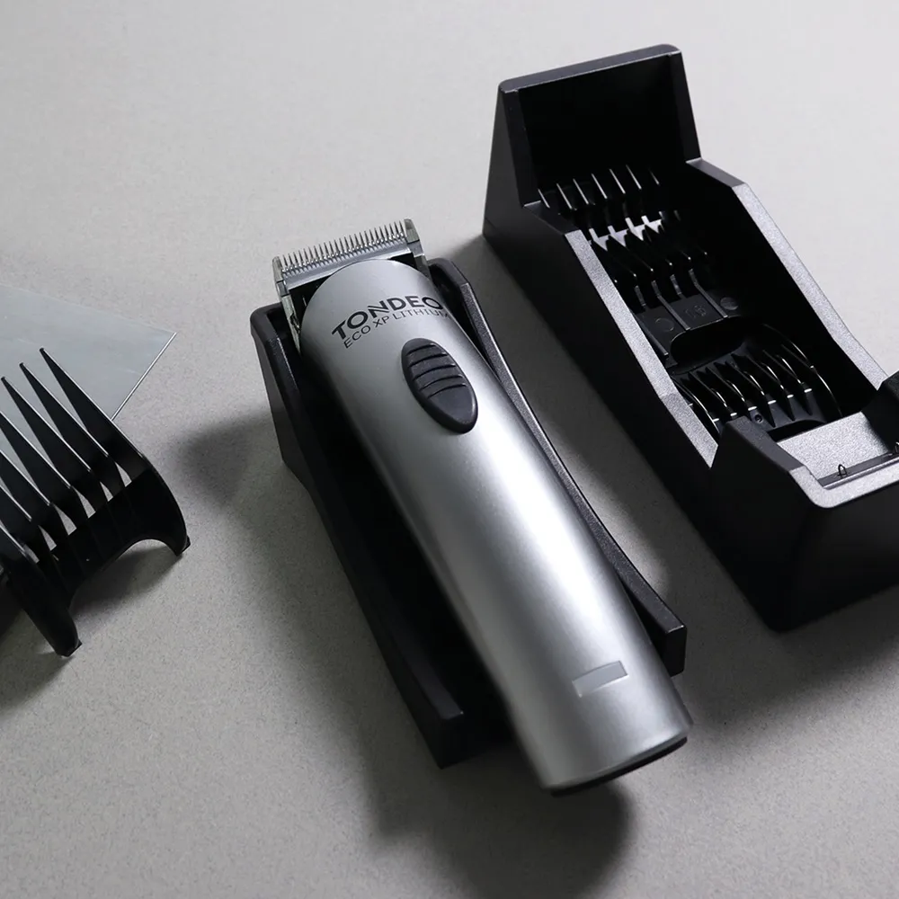 Die Tondeo ECO XP LITHIUM Haarschneidemaschine überzeugt nicht nur durch das elegante, klassische Design, sondern auch durch den effizienten Li-Ionen-Akku mit über 4,5 Stunden Laufzeit ohne Kabel. Der starke Motor ist leise und vibrationsarm. Die innovative Ladestation bietet ein Depot für die fünf mitgelieferten Kämme. Die Schneideplatte aus Karbonstahl mit Hartchrombeschichtung ist 46 mm breit und mit Easy-Clening und Schnellwechselsystem ausgestattet. Mit dem Kammset (4, 8, 12, 16, 20 mm) sind Schnittlängeneinstellungen von 0,8 bis 1,8 mm möglich. Die Ladezeit des Haarschneiders liegt bei 2,5 Stunden und kann mittels Ladezustandsanzeige kontrolliert werden. Wenn das einmal zu lange dauert, kann die Maschine auch mit Netzbetrieb bedient werden.